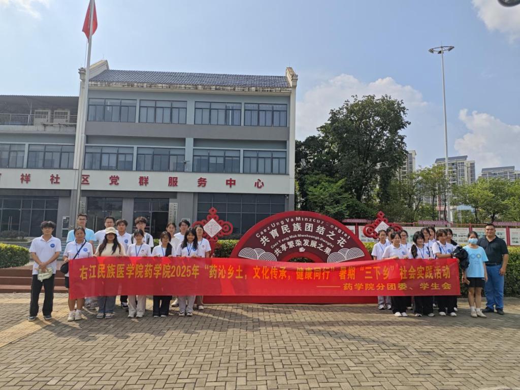 为深入学习贯彻习近平新时代中国特色社会主义思想,积极响应党中央关于“乡村振兴”战略的号召,引导青年学生深入基层一线,在实践中深化国情社情认知,推动理论知识与社会实践深度融合,强化责任担当、锤炼过硬本领,助力乡村振兴战略实施。药学院团学会“三下乡”社会实践团于2025年7月10日在右江区四塘镇深圳小镇百祥社区开展以“药沁乡土,文化传承,健康同行”为主题的“三下乡”暑期社会实践活动。