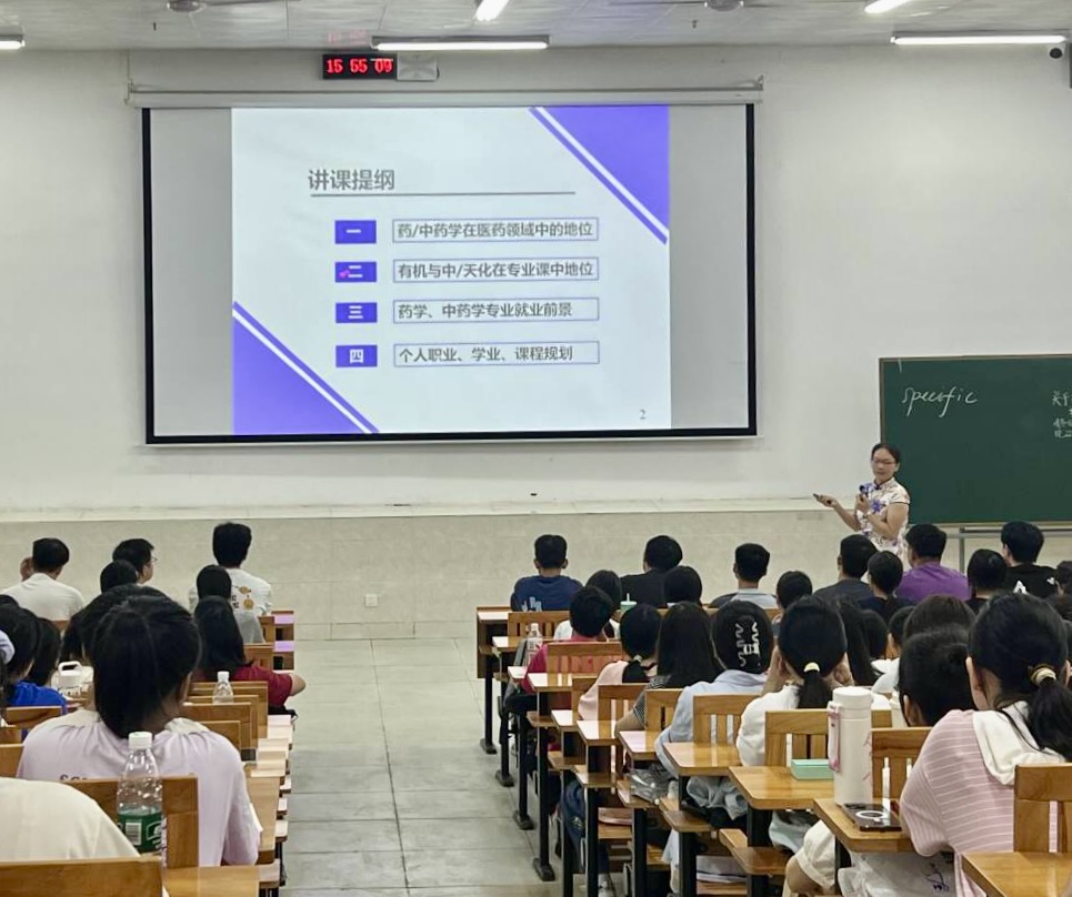 杨彩艳副院长给全体新生进行了药学、中药学专业教育。杨副院长从专业地位与内容、课程设置、就业前景、个人规划方面进行介绍,提升新生们对本专业的认知,以便学生了解专业内容与未来发展方向。
