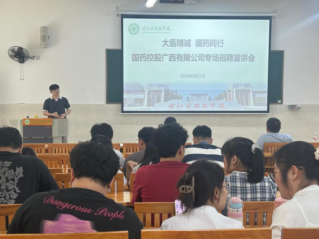 为深化校企合作,助力毕业生实现高质量就业,3月27日上午,药学院携手国药控股广西有限公司,在右江民族医学院百东校区守正楼C-105教室顺利举办专场宣讲招聘会。药学院2026届部分毕业生及2027届全体毕业生参加本次宣讲会。